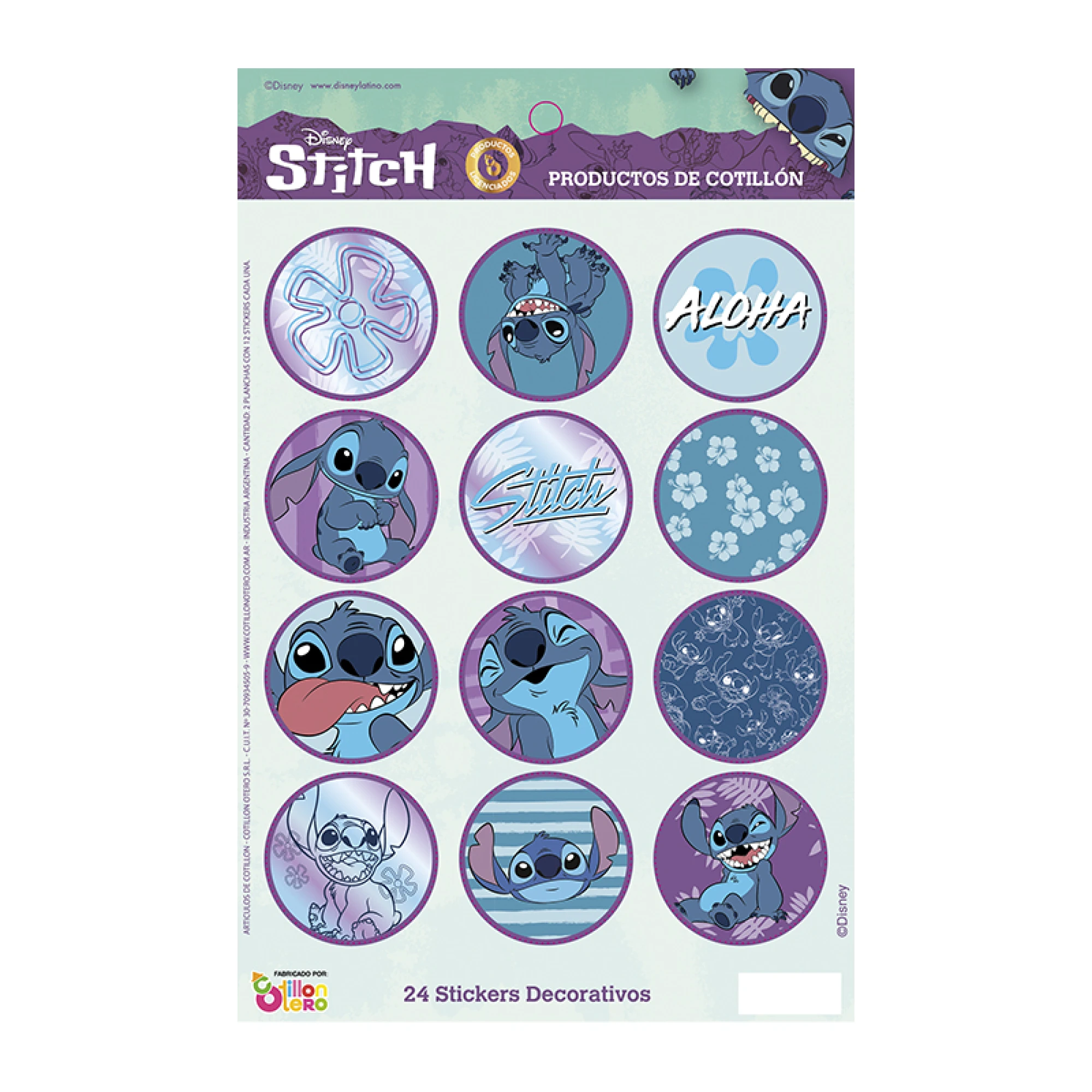 Adhesivos/ Stickers de cotillón con el diseño de Stitch, producto oficial de la película animada de Disney. El pack viene con 24 unidades, 12 x cada lado.